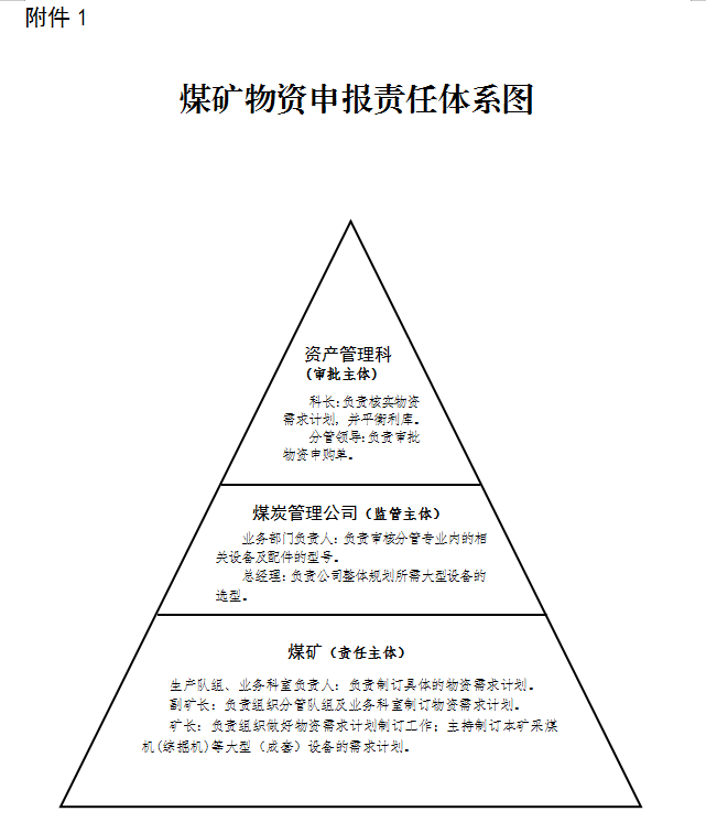 1.煤炭管理公司各業(yè)務(wù)部門負責(zé)人:負責(zé)審核分管專業(yè)內(nèi)的相關(guān)設(shè)備及配件的型號是否滿足需要。其中,生產(chǎn)方面的物資由生產(chǎn)部負責(zé)審核;安全方面的物資由安全部負責(zé)審核;地測、防治水、通風(fēng)等方面的物資由總工辦負責(zé)審核;機電與運輸方面的物資由機運部負責(zé)審核。